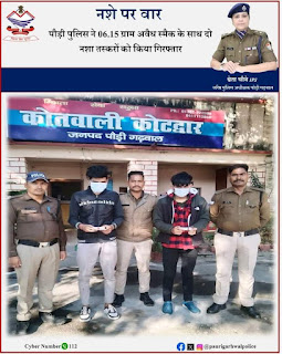 कोतवाली कोटद्वार पुलिस टीम द्वारा दौराने चैकिंग अभियुक्त रोहन नेगी एवं आदित्य अधिकारी को 6.15 ग्राम अवैध स्मैक के साथ रेलवे फाटक कोटद्वार के पास से गिरफ्तार किया गया। जिस सम्बन्ध में अभियुक्त के विरुद्ध कोतवाली कोटद्वार पर एनडीपीएस एक्ट के तहत अभियोग पंजीकृत किया गया।